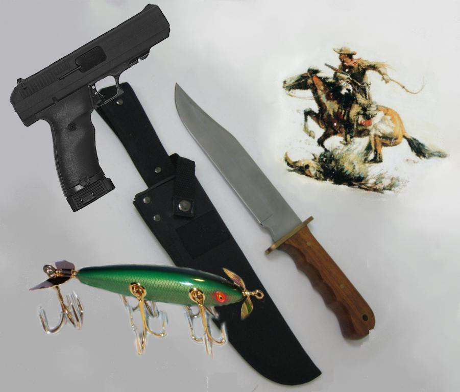 Tarp kitko, tas raitelis - winchester' io logo, nu tik labai jau pensijoj... Dabar anas biski sumodernintas. Ir i kita puse joja. Galvojau, negi neatsiras tarp zveju medziokle siek tiek zinanciu... Ir pistolke, ir peilis - taip pat tos pacios gimines, nu bet kad linksmiau butu iklijavau. Vobleri galite uzsisakyt - sako padaro idealiai... Kas indomu - vobleris penkiu kabliu.