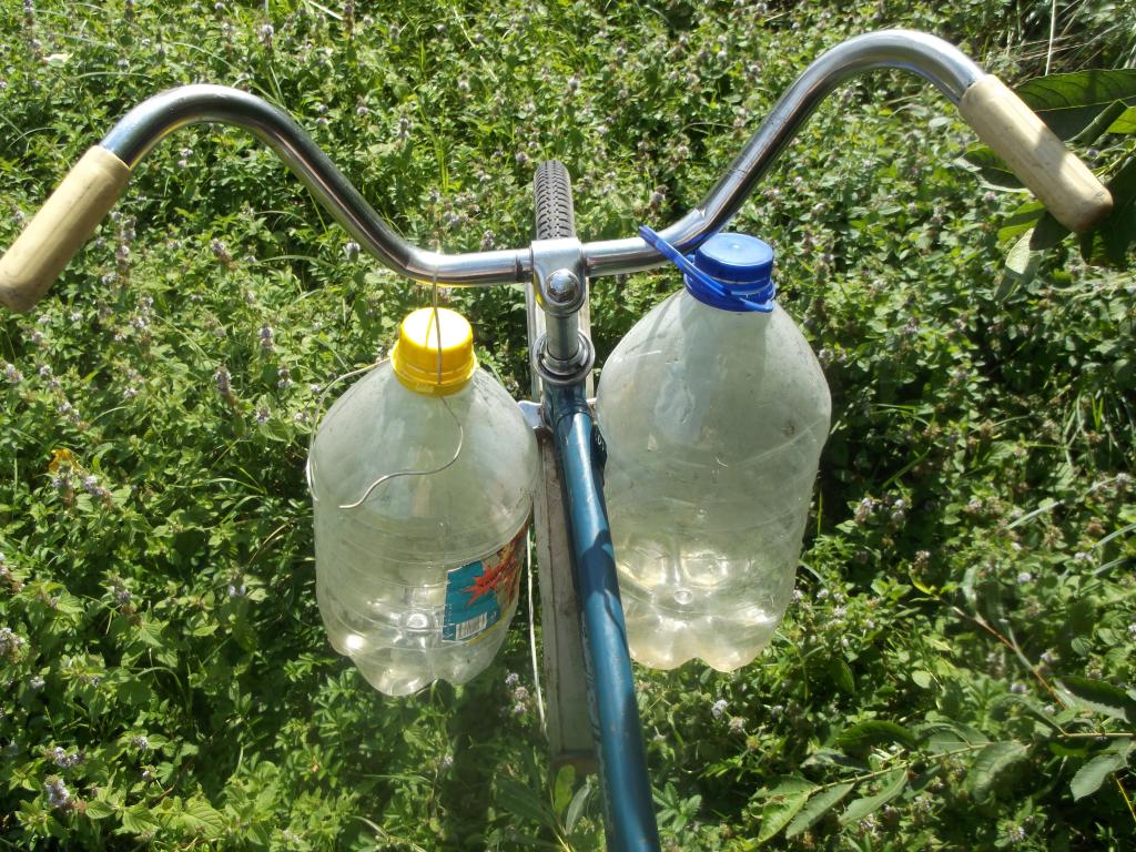 jau seniai dariau gerus darbus tad kol niekas iš stambių žuvų nekimba išvažiavau pasigauti karosėlių žuvinimui.Pernai taipogi žuvinau,per dvi žvejybas buvo pagauta ir pervežta bei paleista per 200 karosėlių.Išvažiuoti neskubėjau,karosai kimba visą dieną.Nuo ežerėlio į kurį buvo suplanuota suleisti karosus iki to kur gaudau apie 4km. kelio tad galima nuvažiuoti ir su dviračiu,taip ir padariau.Mažyliai rudažvyniai buvo transportuojami štai taip: