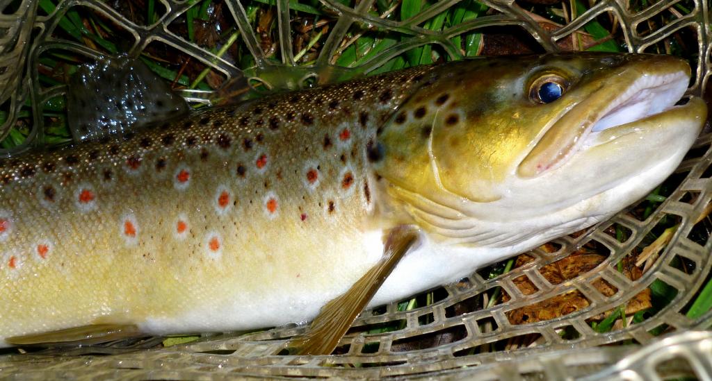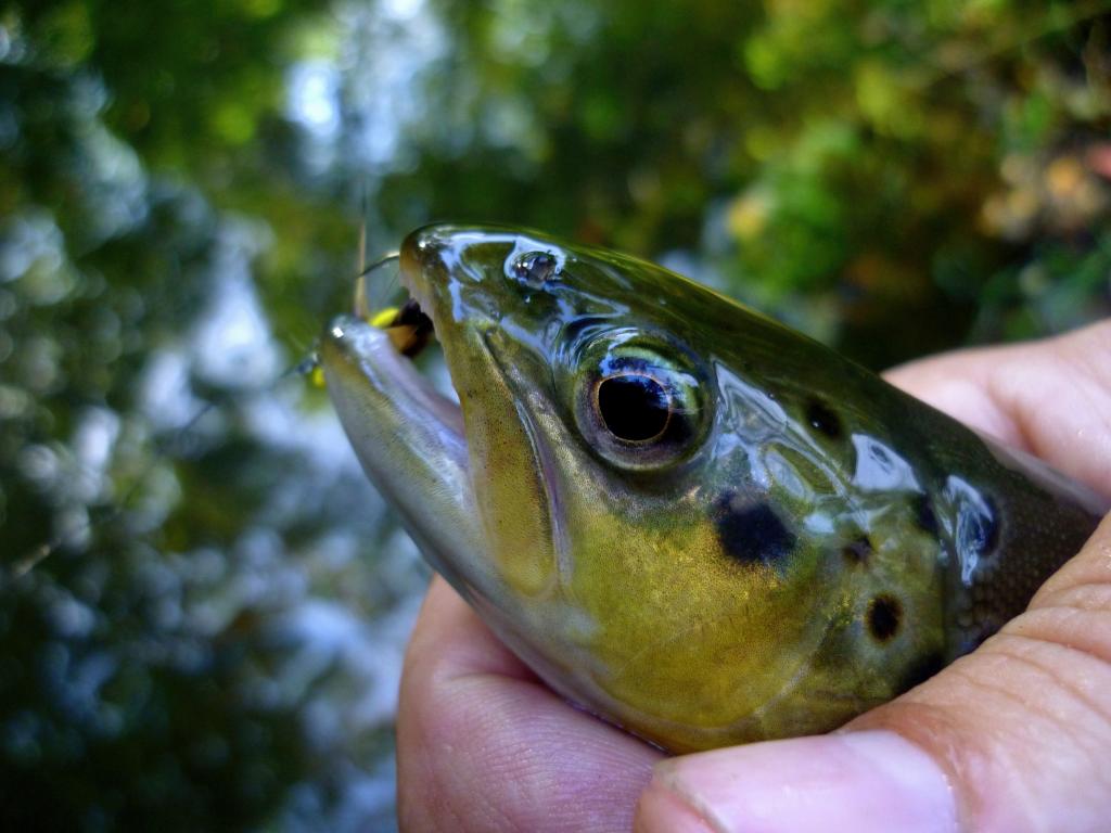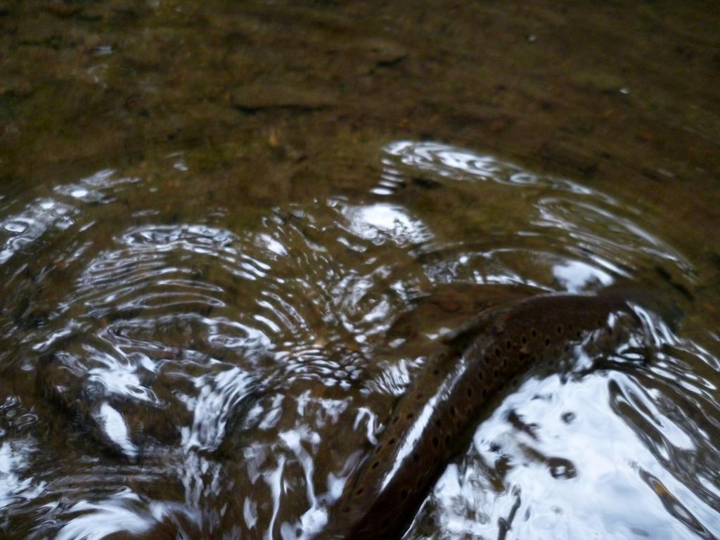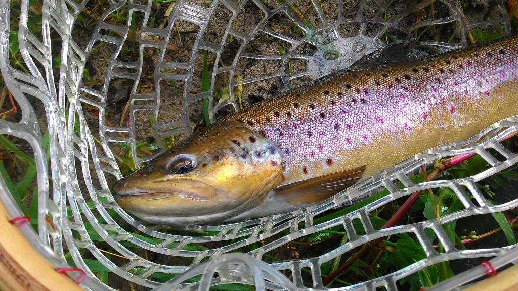 Ir kas per padaras tas žuveliokas. Kiek matau, ryški šoninė linija, raudoni taškai vienoj linijoj. Ir tamsios dėmės ant šonų gražiai išrikiuotos. Pagaunu tokių ir aš, spurda kaip elektriniai. O pagaunu ir tikrų upėtakiukų, kad ir maži, bet daug raudonų, netvarkingai išsidėsčiusių taškų, nėr tamsių dėmių. Gal, sakau, čia paleisti iš veisyklų kokie?
