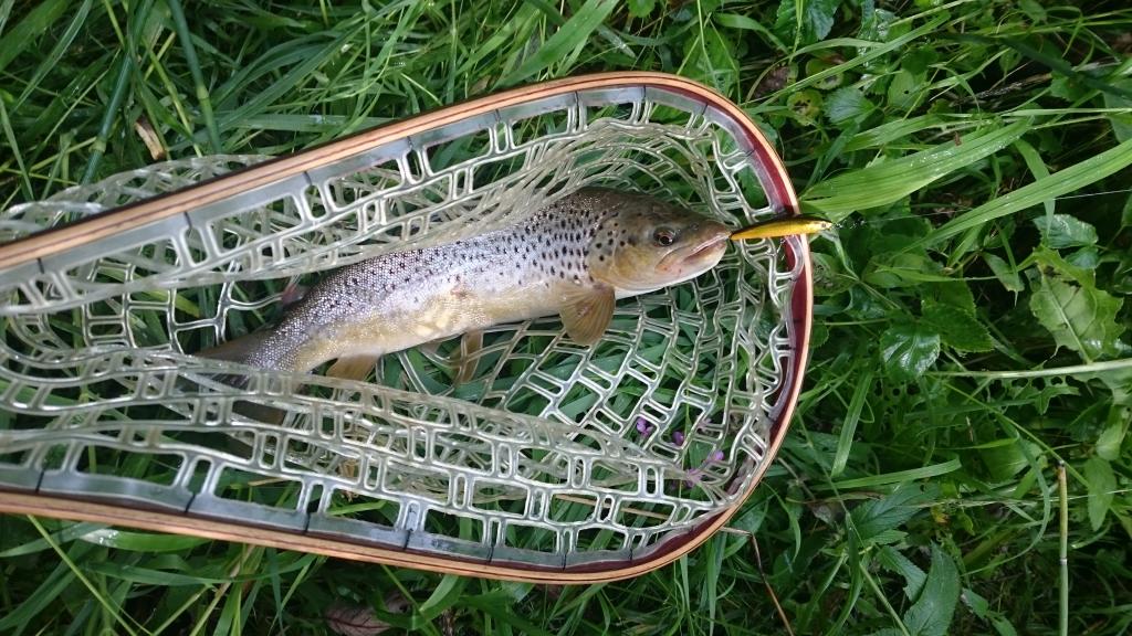 Pirmoje iš perspektyvių vietų keletas metimų ir tik žolė ant kablių... Nu galvoju, dar porą metimų ir slenku toliau... metimas ir spiningas sulinksta... galvoju "žolė"... tada smūgis.. dar vienas... VALIO ''plot - NE ŽOLĖ! Ir visai padori "nežolė". Šiek tiek pakovojam ir užėtakis krante. Tuomet pastebėjau kad masalų atkabinimo replytes palikau mašinoje, o voblerio galinis trišakis visas burnoje ir bent dviem kabliais įsikabinęs. Teko gerokai pasimalti, bet žuvis išlaisvinta... tuomet kitas nusivilimas - metras taip pat liko mašinoje o upėtakio dydis traukia prie asmeninių rekordų... Dzin, pora kadrų ir upėtakis keliauja atsigaudinėti atgal į upę (žvejybos atidarymas sėkmingas).