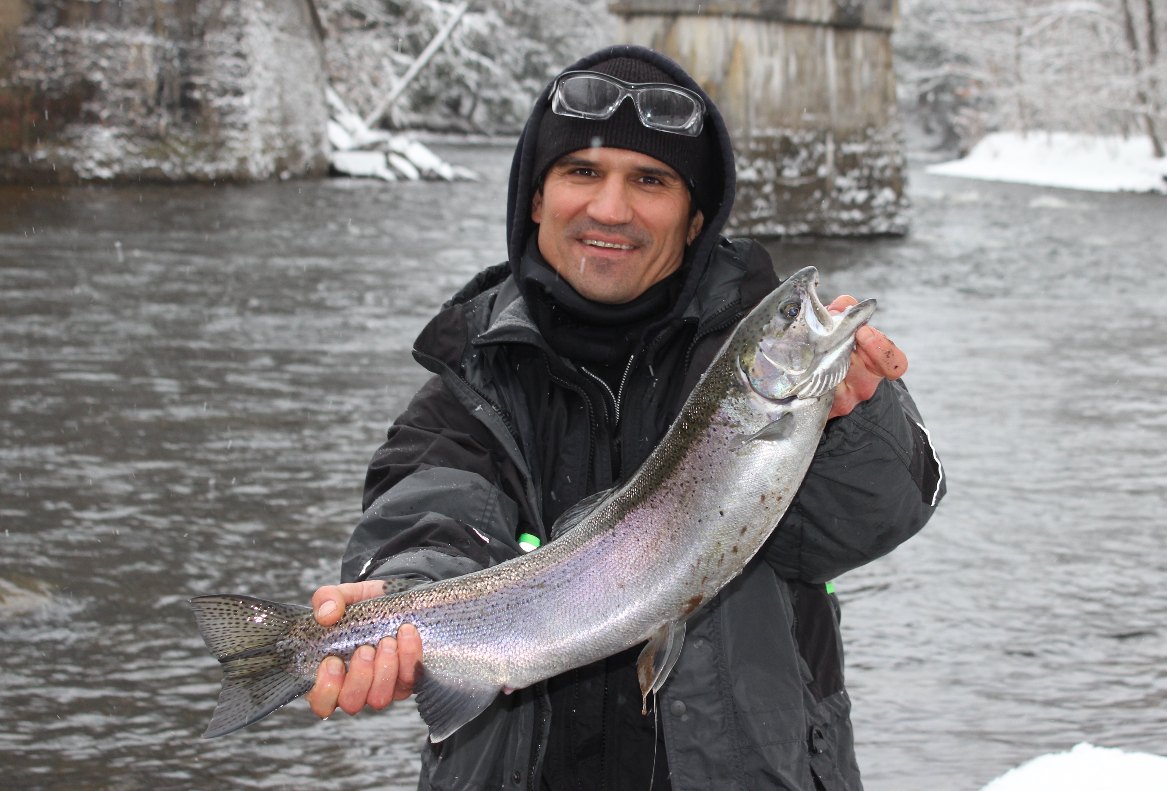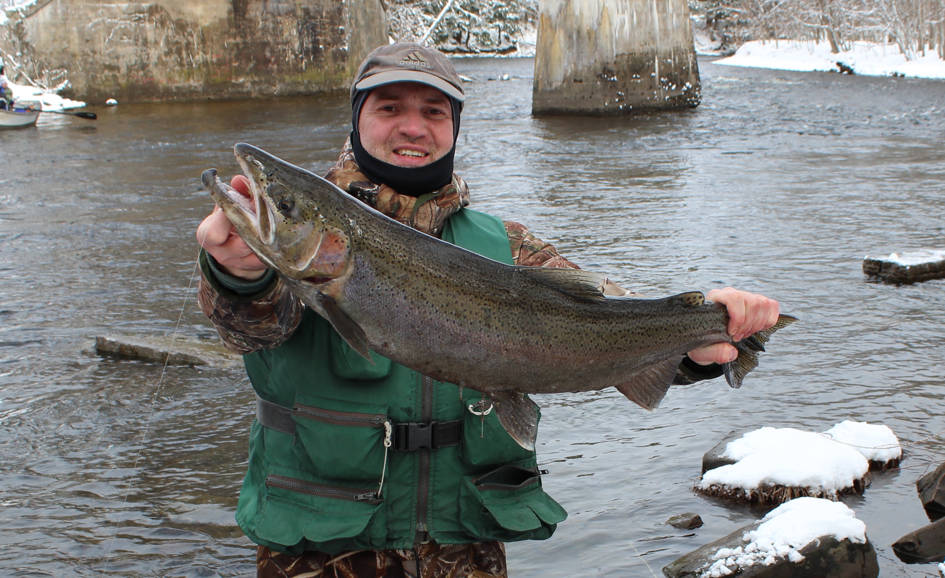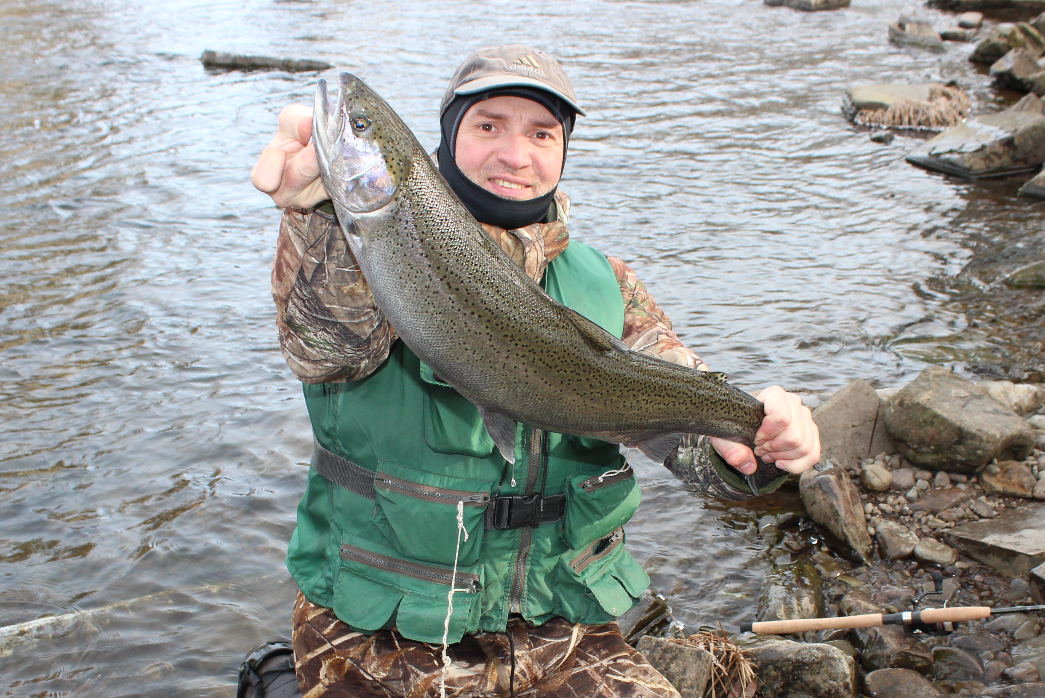 Neužilgo Mindulė pasikinkęs kingą „pravažiuoja“ pro mano žvejybos vietą, o aš ten gal antru metimu pasikertu... steelheadą (matomai jį prabaidė ir praplaukdamas sukėlė apetitą). Gyvai steelheado dar nesu matęs, bet dar traukiant iš vaivorykštinių atspalvių, suprantu, kad čia būtent tas, retasis egzempliorius. Nors jis nėra labai didelis, bet vis tiek neforsuoju, ramiai, duodu pasivargint ir gan nesunkiai susitvarkau.