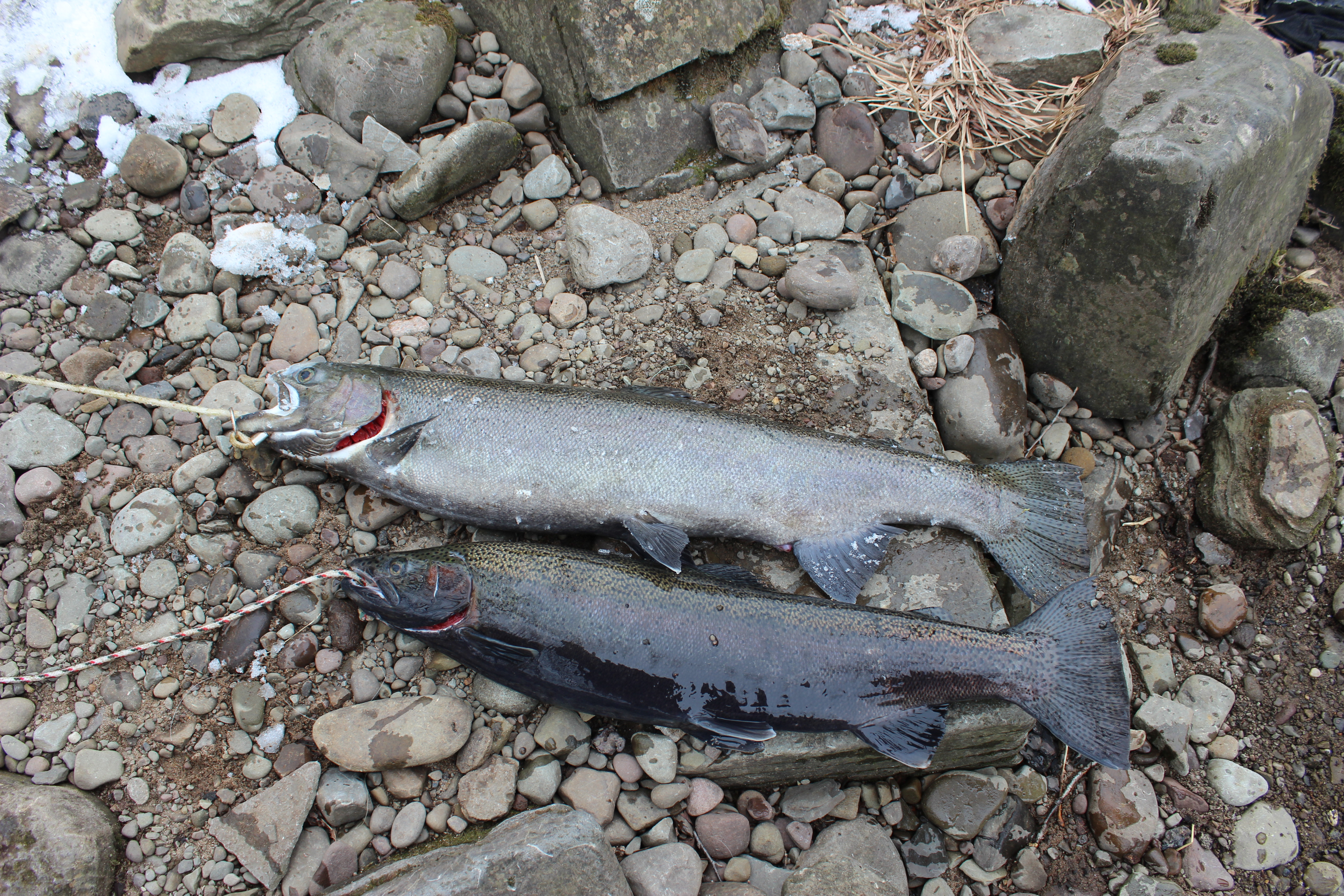 Taigi trumpai papasakosiu koks tikslas ir visą jo istoriją. Mano ir mūsų pagrindinis taikinys – King salmon – lašišų rūšis, kurią šiose vietose įveisė dirbtinai, kai Ontarijo ežere kritiškai padidėjo ežerinių „silkių“ populiacija (nežinau tikslaus jų pavadinimo, bet „who f*king cares“), kurios yra pagrindinis King‘ų maistas. Pačios lašišos taip kaip ir mūsiškės – subrendusios rudenėjant migruoja neršt į upes ir upelius, tik šiuo atveju ne iš jūros, o iš Ontarijo ežero (kurio dydis nėra kuklus – 300x80 km). Išneršusios visos iki vienos jos miršta, todėl po to upė atrodo kaip nuskendusių zombių kapinynas. Yra dar ir kitas lašišos porūšis – Coho. Jos kaip ir King'ai atplaukia neršti ir po to miršta, neužauga tokios didelės, bet kulinariniu požiūriu yra daug vertingesnės. Jų kur kas mažiau, bet pagauti tikrai įmanoma. Paskui King'us ir Coho pasmaguriauti jų ikrais plaukia ir ir Steelhead'ai – kaip mūsų šlakiai, tik vaivorykštinio upėtakio porūšio. Šituos (būtent šiuo metu) jau pagaut labai sunku, kaip Mindulė sakė – geriau ir nesitikėk. Nes paprastas palyginimas, žaidžiant žaidimą, tai jei už pagautą Kingą ir Coho „užsidirbi“ iš kolegos $1, tai už steelhead‘ą - $10. Na ten tiesa dar gyvena ir Brown trout, bet čia jau kita istorija, jį sugauti ir kiek kitokia žvejybos specifiką, ir šiaip jis jau ypatingai retas laimikis. Šias žuvis labai daug kas maišo ir neskiria, nors mano akim žiūrint tai padaryti tikrai nėra sudėtinga. Beje per dieną galima pasiimt viso 3 žuvis, iš jų tik vieną steelhead‘ą.