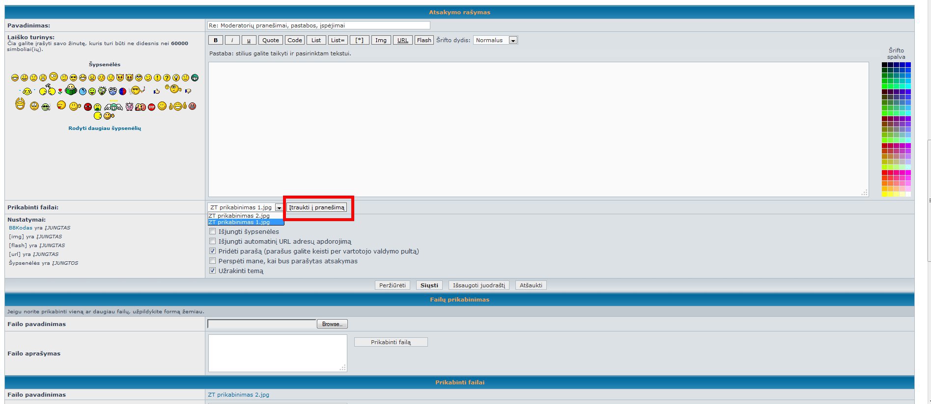 Rašant žinutę, norit įterpti paveiksliuką tarp teksto, žemiau rašomo teksto yra tokia eilutė "Prikabinti failai" su iškrentančiu šių failų sarašu. Norimoje vietoje tekste išsirinkus failą paspaudžiame "Įtraukti į pranšimą" ir nuotrauka pasirodo štai taip: