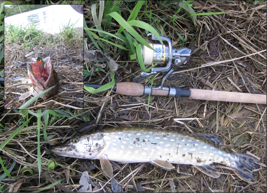 Po savaitės, t.y. vakar, truputį atšilus orams vėl pabandėm. Tik atvažiavus patikrinau vandens šilumą. Tai ant tiek šaltas, kad toks pat balandžio pradžioj buvo - ledinis. Tiesą pasakius jau galvojom iškart namo varyt, net nevyniot meškerių, bet buvau pasiėmęs spiningą, nes norėjau lydekų pabandyt. Tad pora valandų nesulaukus kibimo ant dugninių išėjau pasivaikščiot su spiningu trumpam. Žvejojau negiliai iki 1m. visai apžėlusiam plote, tad reikėjo pačiam paviršiuj pravest. Pramėtęs walk'erius ir nieko nepešęs pamaniau, kad geriau būtų turbūt po vandeniu truputį pratraukt, nes bangavo. Užsidėjau lm44 ir pradėjau tvičint. Užeinu tarpą, kur visai nėra žolių. Nei ant dugno, nei pavienių ilgų. Antru metimu, betvičinant, kažkas grybšteli, nestipriai kirsteliu iš įpročio tvičinant ir paskui dar vieną galingesnį - Yra