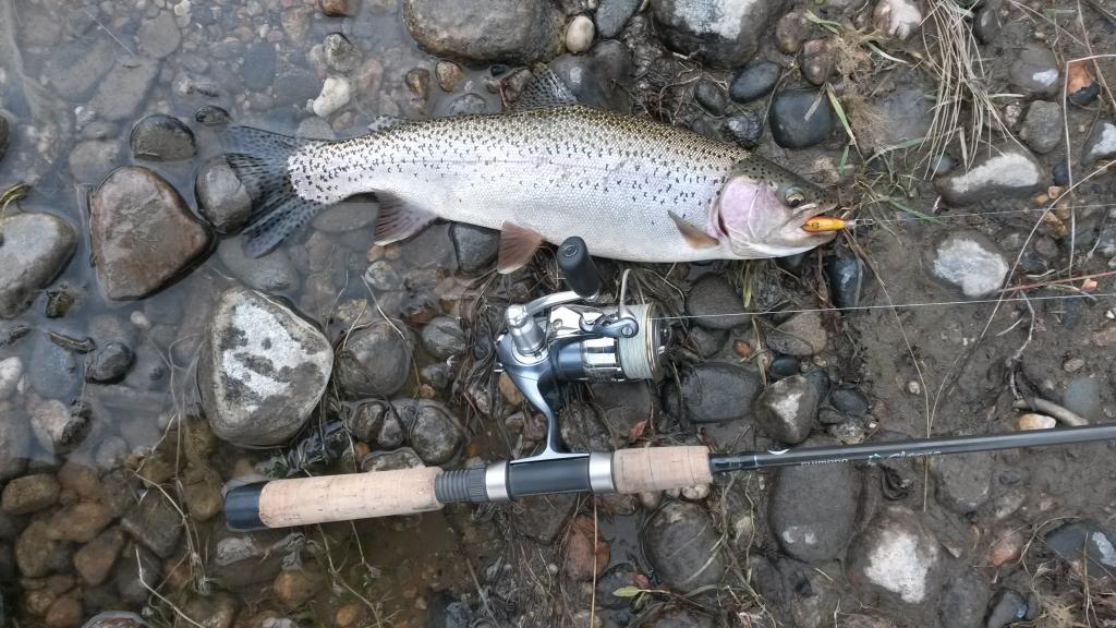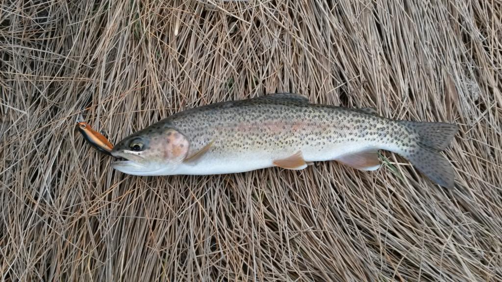 Trumpa fotosesija ir zuvis keliauja namo. Tik mano nuostabai tas vaivorykstinis tai toks storulis, sakyciau pagal stori ir mase turbut dvigubai storesnis nei kad butu panasaus ilgio margasis upetakis. Dar keli metimai ir vel seda vaivorykstinis, pradeda sokinet, draskytis, matau, kad zuvis kiek didesne uz pirmaja, taciau atsipurto ir kranto nesiekia. Paarsitraukiu savo komachi ir matau, kad zuuvis visgi ne atsipurte, o atlenke originalius ant vobleriuko uzdetus plonavielius kabliukus. Atstatau kabliukus i pradine bukle ir tesiu zvejyba. Dar keli metimai ir man jau spurda ir is vandens sokineja grazus margasis upetakis. Taciau ir sis atsipurto ir kranto nepasiekia. Na, jei kimba tokios grazioso zuvys tai nusprendziu nebesiterliot su mazu vobleriuku mazais kabliukais ir dedu 8cm ugio taip pat savo itin megiama Jackson Artist vobleriuka. Deja, bet keli pirmi metimai ir suprantu padares klaida. Kadangi gylio siose vietose labia nedaug, tai artistas visoj toj kliokiancioj revoj tiesiog nuo dugno “ravi siena”. Nusegu vobleriuka ir bandau savo dezutej ieskoti ko nors didesnio kas plauktu itin negiliai. Kaip noretusi dabar su savim tureti Jackson Dead Float modeliuka. Jis mano supratimu siom vietom tiktu idealiai.Bet kazkodel kraudamasis voblerius as jo is namu nepasiemiau ir sios keliones metu veliau dar ne karta del to labai gailejausi. Na bet negali gi vaziuodamas i darbine komandiruote susikrauti su savim visus savo turimus voblerius. Imi tik butiniausia isgyvenimui minimuma. Perkrates visa dezutes turini suprantu, kad deja, bet be komachi daugiau neturiu nei vieno siom zukles salygom tinkamo voblerio. Na vadinasi pirmas pasirinkimas buvo terisingiausias, o ir zuvis kibo, tai grazinu atgal i darbine padeti komachi, tik kad neatlankstytu jam kabliuku juos pakeiciu i nuimtus nuo didesnio voblerio. Pasitikrinu vandeny ir su didesniais bei storesnes vielos kabliais komachis vis dar plaukiantis ir vis dar jam budingai vizgina savo uodega. Na vadinasi teks testi zvejyba nebeeksperimentuojant su masalais. Bet to ir nereikia, nes ir toliau gana noriai kimba tiek vaivorykstiniai tiek ir margieji upetakiai. Tiesa, jau gerokai mazesni del ko nusprendziu siek tiek pakeisti zukles vieta. Sedu i automobili ir palekiu iki pakeliui vaziuojant matytos automobiliu stovejimo aiksteles kiek pasroviui Madison upe ties santaka su Cherry creek upeliu. Aiksteleje susitinku kelis meskeriotojas nusileidinejancius i upe “driftine” valti. Jus turbut nepatikesit, bet cia meskeriotojai net ir prie upetakiniu upiu turi patogiai irengtas valciu nuleidimo vietas.
