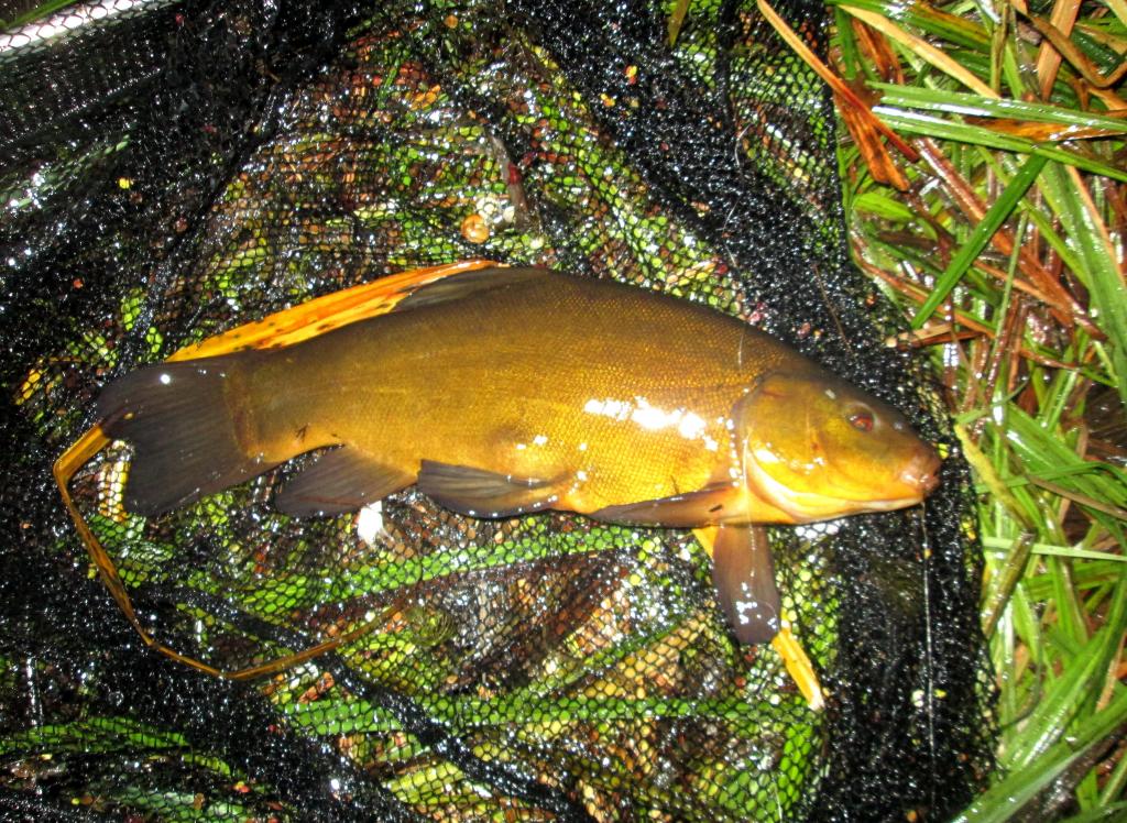 Mosteliu meškerykočiu, iš pirmo karto pataikau puikiai į vietą, ir ,vietoj laukto plūdės šokio tymt tymt tymt, kaip jinai elgiasi, kai kimba smulkmė, pamatau, kaip iš lėto grimsta dugnan. O taip būna tik tada, kai masalą paima rimtesnė žuvis. Pakertu, joooo, širdis apsidžiaugia , anam gale priešininkas visai neblogas, kotas net trata nuo jo priešinimosi, bet aš stipresnis, prisitraukiu neskubėdamas , leisdamas žuviai šiek tiek pavargti, kad būtų ramesnė ir sugriebęs įsikeliu valtin... Ėch , nubraukiu prakaitą