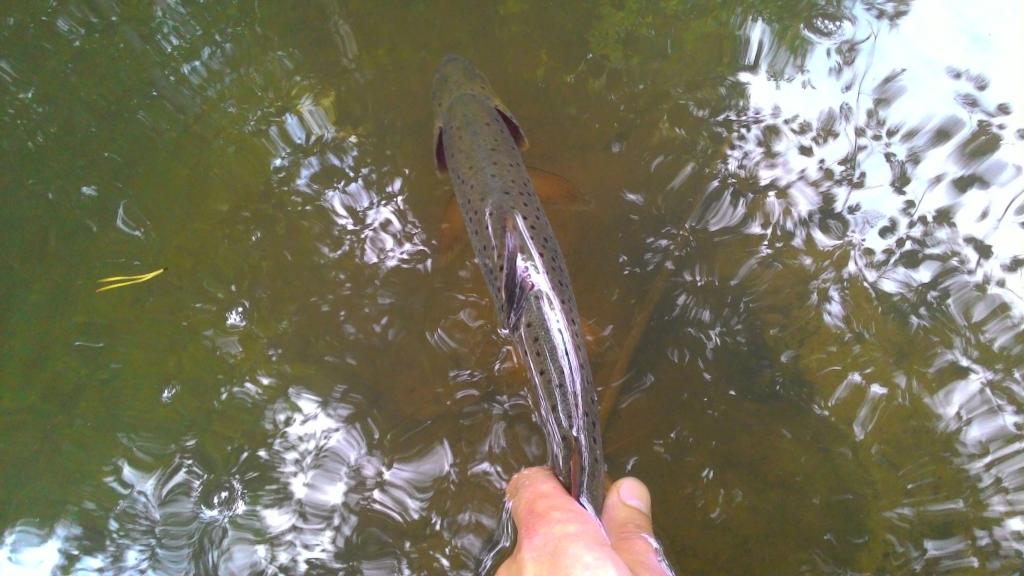 Vakar vakare pagauta, matyt, patelė. Labai stora. Fotkinta telefonu su blykste, kokybė nelabai. Pirmą kartą griebė mažą vobleriuką tokioj lydekinėj vietoj. Tai užsidėjau plieninį pavadėlį ir ryškiaspalvį, rastą pavasarį ant šakos 6 cm voblerį, tikėjausi lydekos. O pasirodo visai graži upėtakienė, apie 45 cm (pagal žymę ant koto). Prie to paties: savaitgaly žadu poilsiauti prie Virvintų ežero, Sodyboje pas Pauliu. Galvoju pusdieniu ištrūkti pažvejoti. Domina Virvintos upelis. Kaži