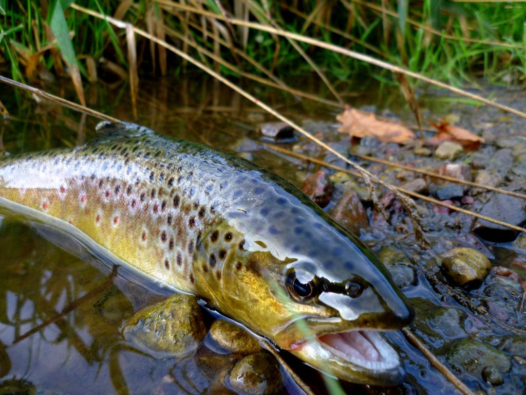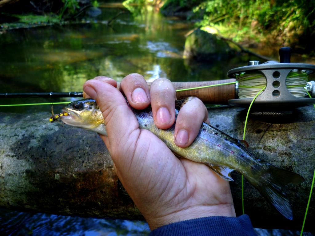 Ir kas per padaras tas žuveliokas. Kiek matau, ryški šoninė linija, raudoni taškai vienoj linijoj. Ir tamsios dėmės ant šonų gražiai išrikiuotos. Pagaunu tokių ir aš, spurda kaip elektriniai. O pagaunu ir tikrų upėtakiukų, kad ir maži, bet daug raudonų, netvarkingai išsidėsčiusių taškų, nėr tamsių dėmių. Gal, sakau, čia paleisti iš veisyklų kokie?