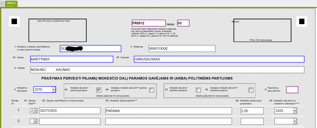 Valstybinė mokesčių inspekcija primena, kad prašymą (skirti 2 proc./1 proc. paramai nuo savo sumokėto Gyventojų pajamų mokesčio (FR0512)) gyventojai gali pateikti tik individualiai.
