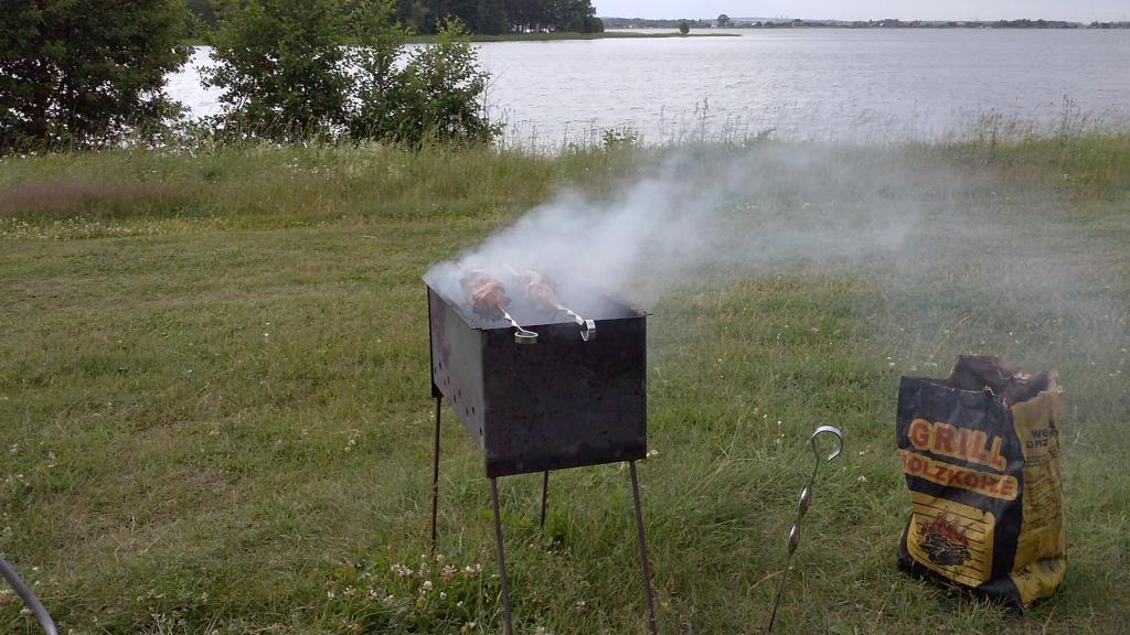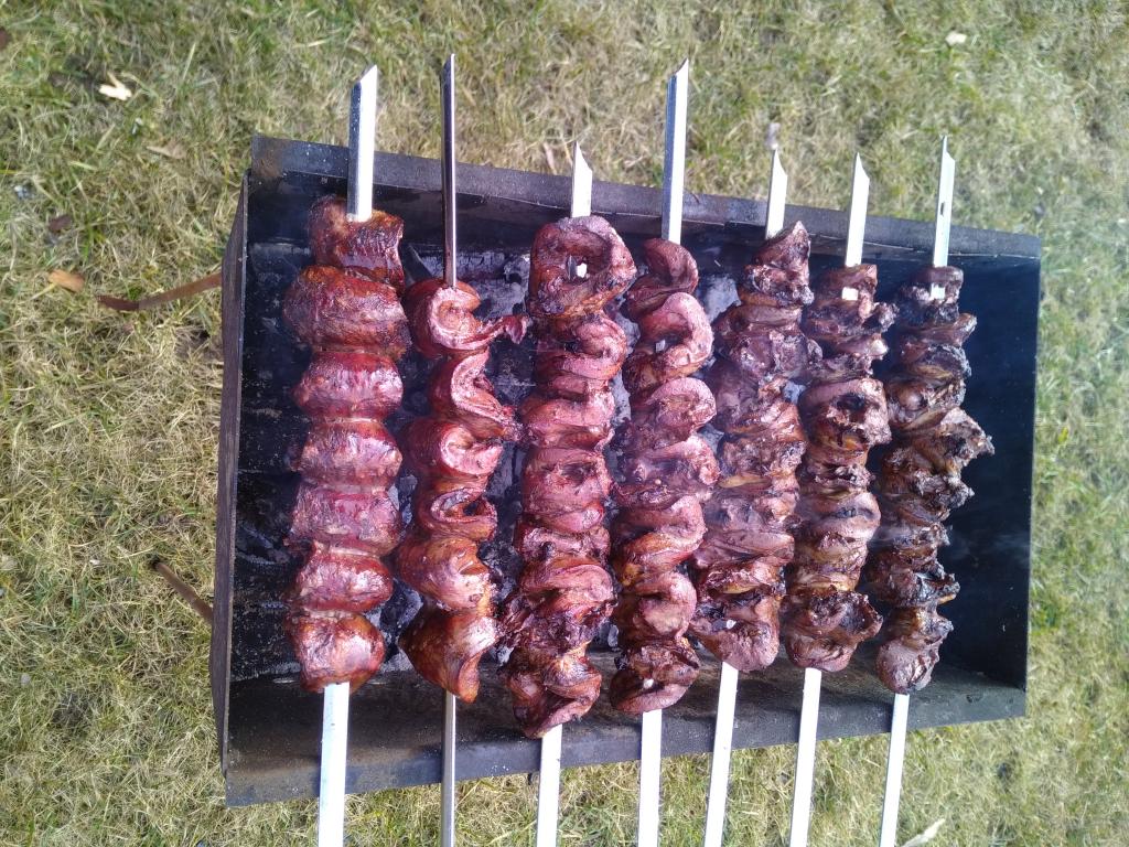 bia klupinejo jis ten prie tos saslykines,, vis laike ranka virs,, tai damesdavo tai isimdavo malkas is saslykines,, zodziu kai jau jis nusprende kad zarijos geros,, sudejo iesmus ir kepe bijau sumeluoti,, apie 15 min... maciau karts nuo karto islysdavo atvira ugnis,, bet jis kazkaip ramiai reagavo,, negesino jos,, o priesingai prasukdavo saslus ant ugnies...