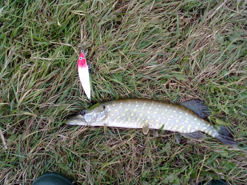 8 ryto, vel prie vandens - bandysim kompensuot vakar dienos neskemes. Judesio ant vandens ne rasta - negerai juk man tai the must - na nieko dar miega krokodiliukai, islys... Vandenukas raibuliuoja, vejukas - nieko viskas bus ok. Pradedu metyt guma ir einu pakrante kas keli metrai uzmesdamas 5-10 kartu... nieko... nei kibimo nei judesio ant vandens. Atvyksta kolega susimeta tris meskeres ant gyvos ir laukia savuju auku kitam krante. As pradedu vel liudet nusprendziu pabandyt vobleriuka gaila neturiu pavirsinio nei vieno... imu Salmo Minnow 7 toks tipo eseriuko spalvinimo bet jis skestantis... bet traukiant ramiai iskelta meskere jis varo gal 30cm paneres - kazkas tokio ko ir norisi - siaip manau uzsipirksiu biski rapalos kazkaip su vobleriuku tas spiningavimas toks subtilesnis gaunas, smulkmenisksnis kas visai patinka. Taigi prasivedineju as ta vobleriuka palei zoles... prasivedineju ramiai neskubedamas stengdamasis islaikyt norima gyli ir nepakabint zoliu. Ir staigi taip ilgai lauktas BUMT. Toks jaudinantis bet tuo paciu toks neiprastas... pakertu ne per smarkiai ir ne per mazai viska darau atsargiai atsilaisvinu stabdi ir dabar vienintelis planas nesikarsciuot ir ramiai parsitempt tuos metrus svelniai ir atsargiai kad tik neatitruktu jei kabliukai isisege nevisai konkreciai. Taigi prasideda parvedimas. Zuvis siek tiek I pavirsiu supliuska ir vel gilyn bet... taip keistai... nu taip neiprastai - matau kad nemaza, bet kazkokia persisukus kazkaip mazai draskos ir nebando sokti... nu fak nesvarbu - parsivedinejam ja toliau ir.... kai visai prie kranto pamatau kad... cia jokia ne lydeka o ksrosas blin... vobleris ismiges tiesiog I uodega butent taip kaip matot fotkej: