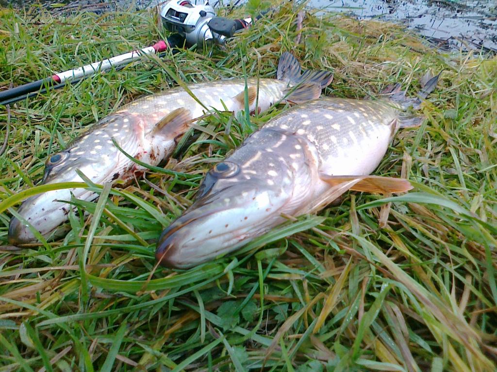 Šį kart ant žolės padėjau, nes dvi lydekaites radau, bet vėl kažkokios nerudeninio dydžio, tik 45 ir 46 cm, bet taip viena gumą įrijo, jog pro žiauną išlindo :-D