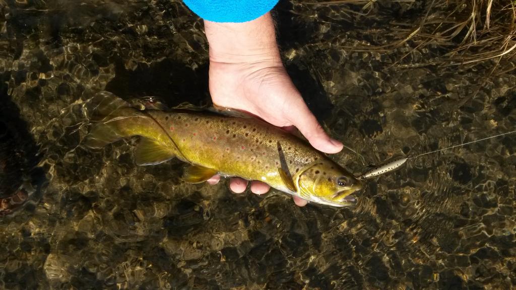Neturiu jokio noro bendraut su sita publika, tai islaikydamas atstuma pereinu is naujo i ruozo pradzia ir stebedamas upetakiams infarkta ivaryt bebandancius “raudonsprandzius” prisirisu atgal buggeri bei pradedu is naujo leistis ruozu pasroviui. Po viso sito triuksmingo vietiniu aborigenu pasirodymo dideliu vilciu ruoze pagaut upetaki nebeturiu. Taciau, kaip atsirade, taip nieko pagauti nesugebeje “kolegos” dingsta man is vaizdo. Ruozas po truputi rimsta, taciau jau arteja vakaras ir laikas baigti zvejyba. Letai leidziuosi ruozu zemyn ir pacioj ruozo pabaigoj issokes is po kelmo, kai as maziausiai to tikejausi, mano bugger’i atakuoja grazus mazdaug 35 cm margasis upetakis. Po kiek truputi ilgiau nei deretu uztrukusios kovos,mat dar teko prisimint ir kaip su museline traukt zuvi, upetakis trumpai fotosesijai atsiduria krante.