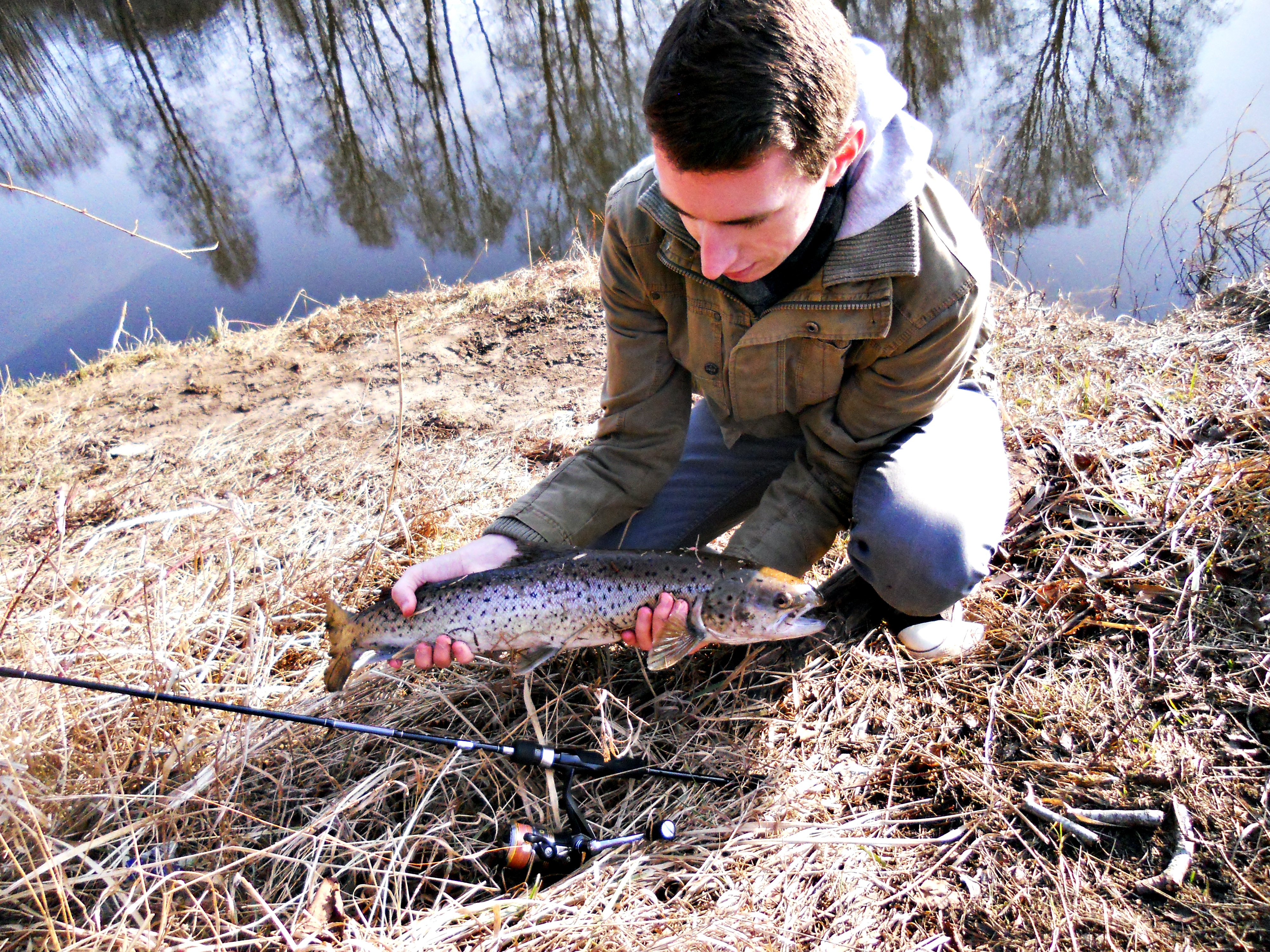 Na o pirmadienį jau su spiningais prie upės. Vanduo žemas, žiedai šąla. Bet gaudom. Pakilus saulutei nugarą pradėjo visai maloniai šildyti. O apie pietūs ir ilgai lauktas kibimas. Smagi kova ir 62cm, 1,96kg šlakis krante. Atiduota duoklė objektyvams ir žuvis, žinoma, keliauja atgal.