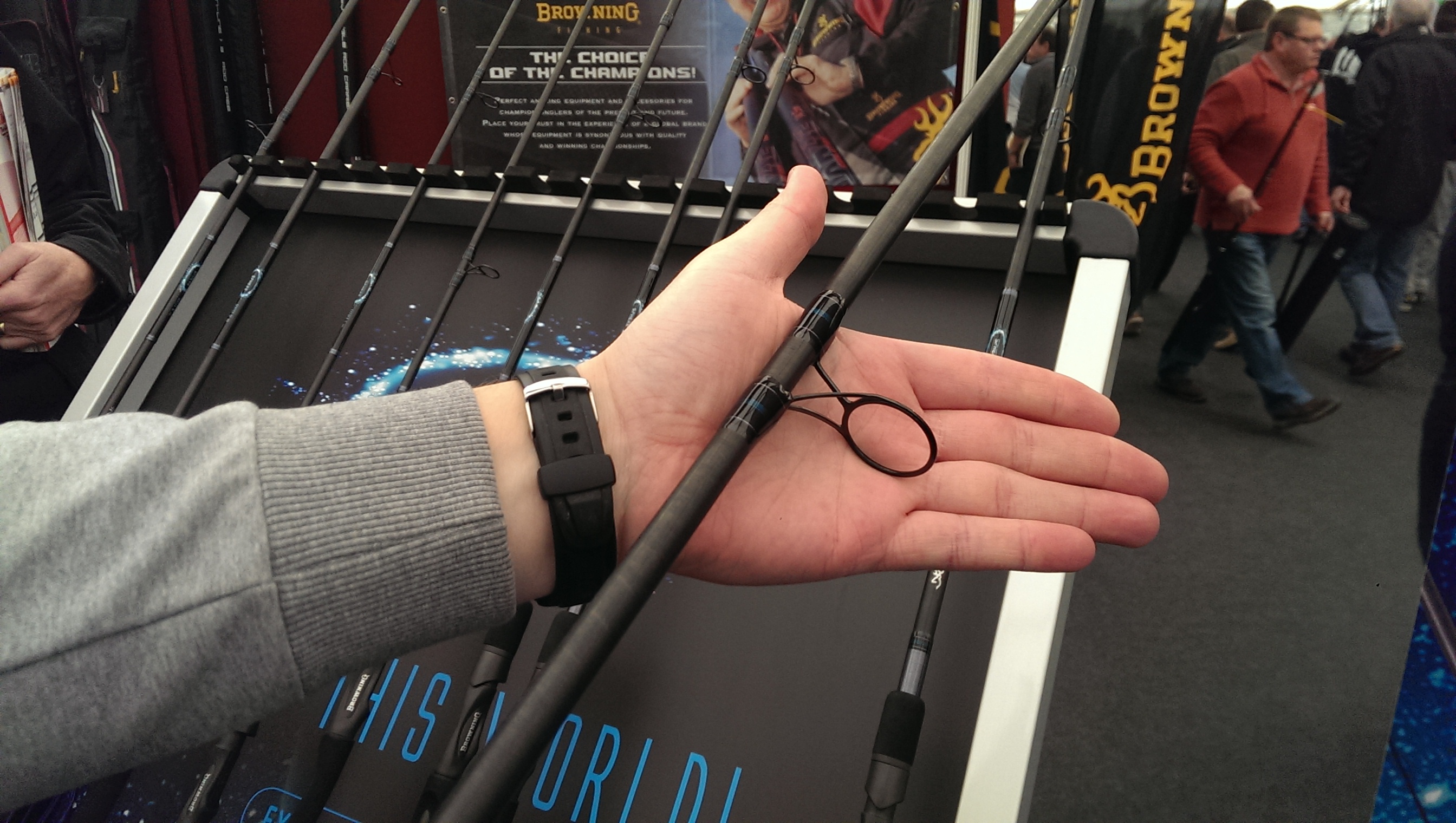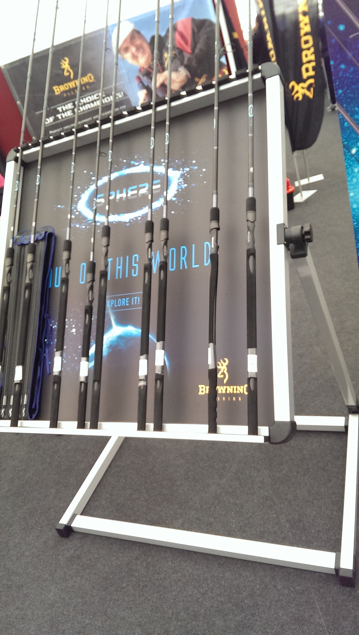 Sekantis stendas buvo "Browning", iškart akis patraukė stendukas su "sphere" feeder'iais. Nerealiai lengvi, rankena apipjaustyta, išpjovos pirštams rankenos apašioje, viršuje nykščiui, fuji skeleton žiedai, fuji ritės laikiklis. Pirmas žiedelis (nuo ritės) didelis lyg karpinės meškerės ir gan aukštai prasidedantis. Žodžiu pojūtis laikant nerealus, standokas. Paklausėm kainos... 400 karališkų ir tai parodos kaina, sakė parduotuvėse kai pasirodys kainuos mažiau.