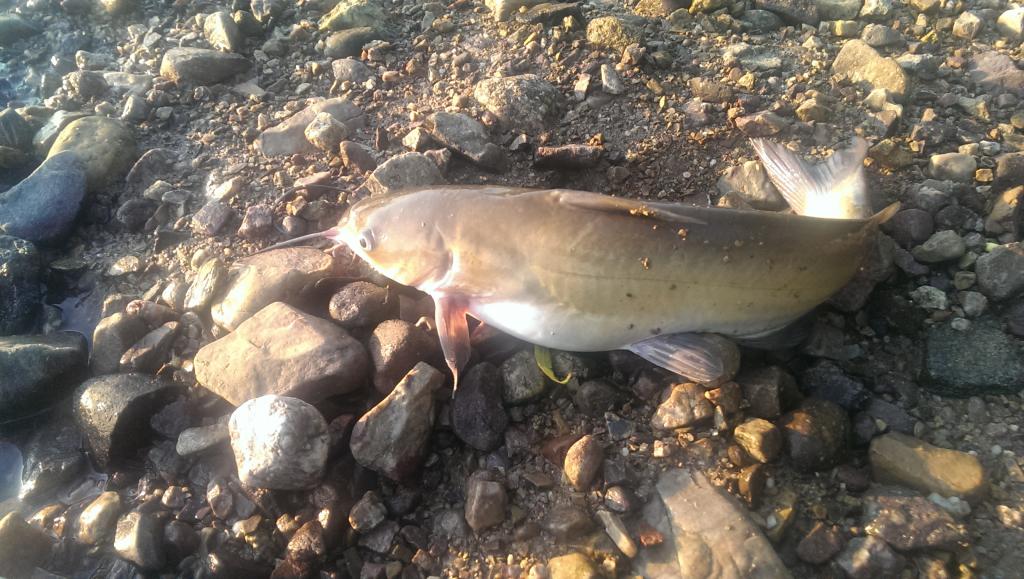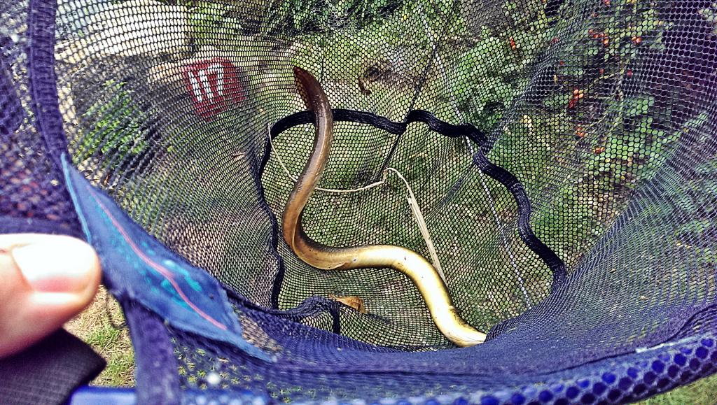 Paleidus mano šiandienos didžiausia žuvį galvoju mesti kuo greičiau, gal pavyks dar vieną išprašyti krantan. Deja bandau imti savo valą, matau šėryklą, bet kabliukas su masalu po akmenimis. Traukiu link savęs, o valas tik šmaukšt atgal. Asižiūriu batus, na lyg ir neužkliuvo niekur. Bandau vėl, taukiu link savęs, o jis atgal. Stoviu žiūriu... Pasikviečiu Andrių, parodau jam ta pirmyn atgal žaidimą. Jis padaro išvadas, kad vėžys slėpynių žaidžia. Pritariu ir bandau toliau atgauti savo kablį su laimingais sliekais. Kelios minutes slėpynių ir iš po akmenų pasirodo jis. Taip jis, mažas, naglas unguriukas. Nuotabos apimtas susigraibau graibštą ir apgyvendinu laikinai savo naują svečią. Aišku, kabliuko ir sliekų neatgaunu, tenka kirpti pavadėlį ir slapukas unguriukas keliauja atgal.