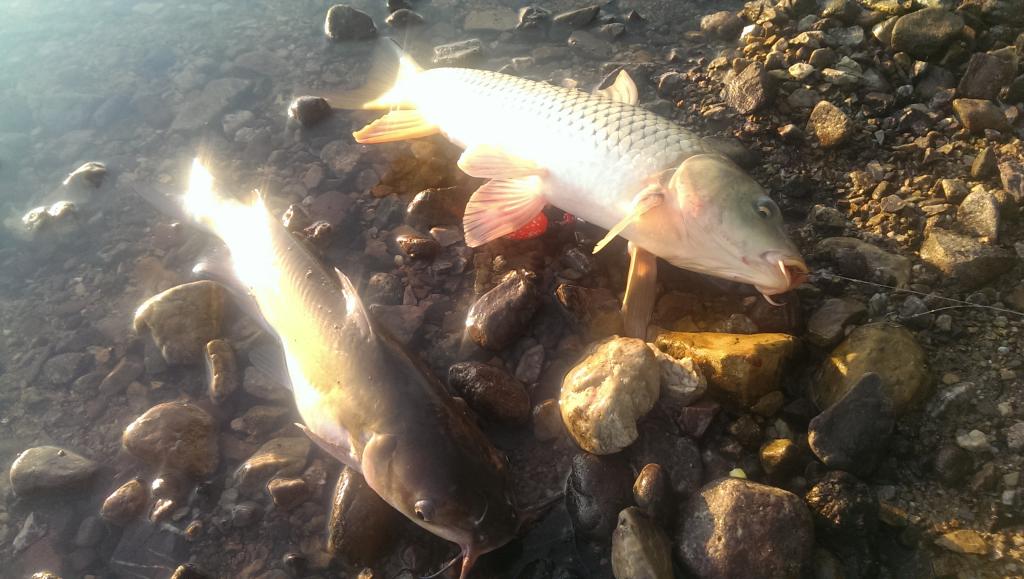 Aš kaip visad ką nors pamiršęs, šį kart platformos stalą, jis toks didelis, kad net nustebau, kad palikau namie... Ir aišku kukurūzai liko namie laukti kol pateks į salotas. Pradedu žvejybą su musės lervomis. Veiksmas- iškarto. Pirmieji "hibridai" keliauja į tinklelį. Andrius, iškart nusprendė, kad ims "jautį už ragų" ( šiuo atveju karšius už lūpų). Tad ant "plauko" įtaiso du sliekus ir kol aš "šudeliauju" su hibridais jau turi pirmajį savo karšį.
