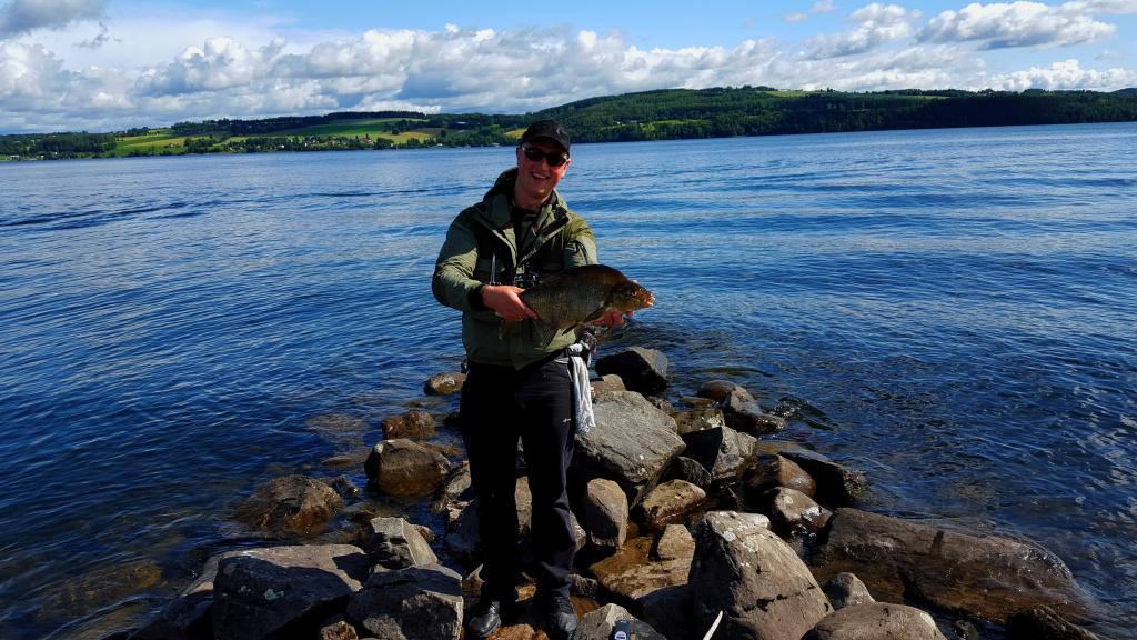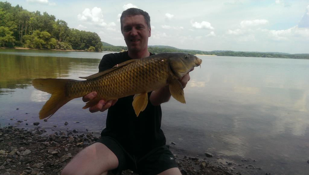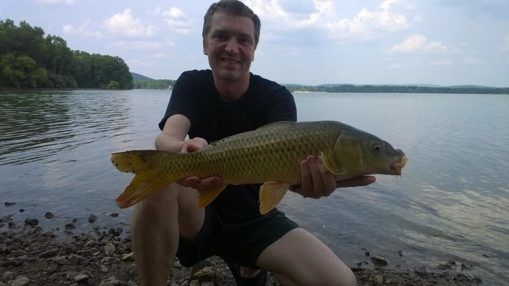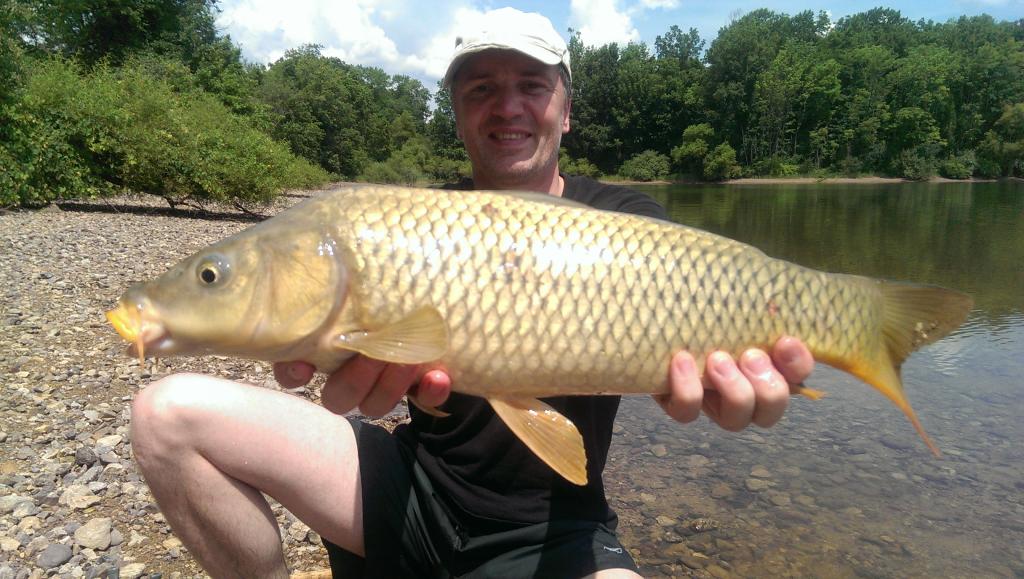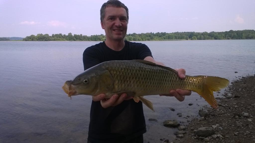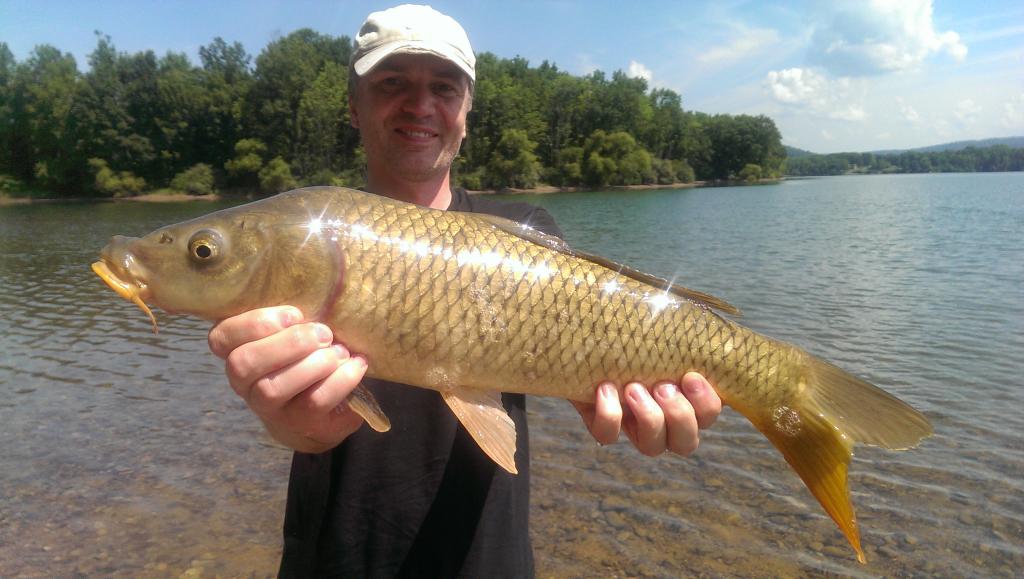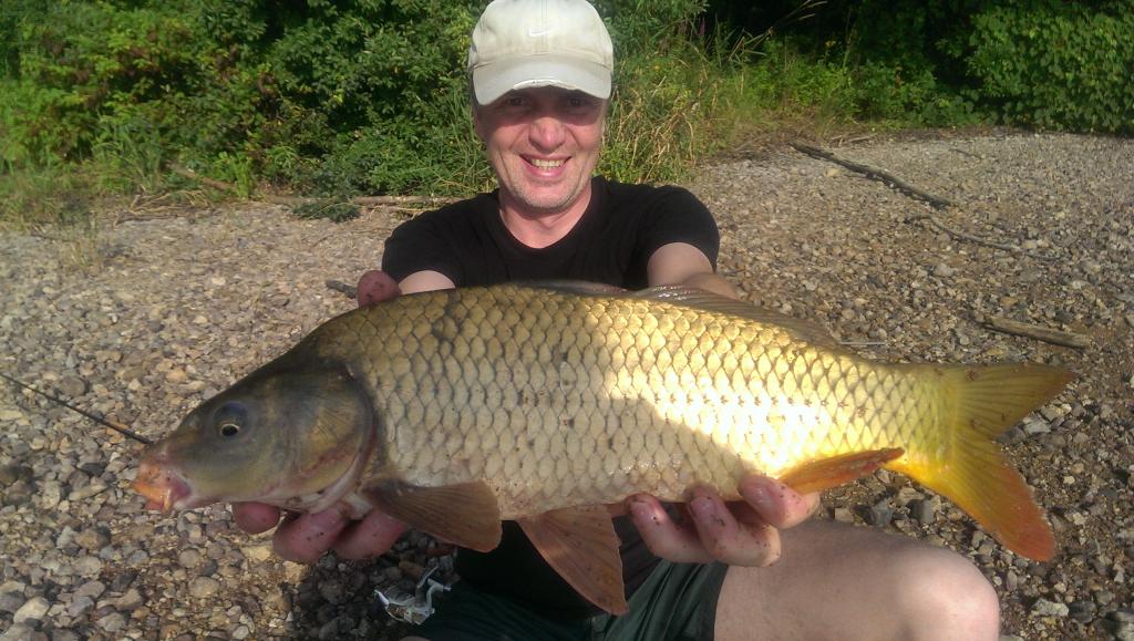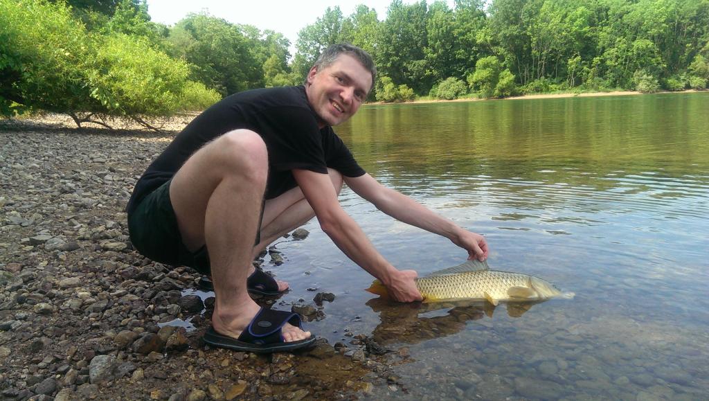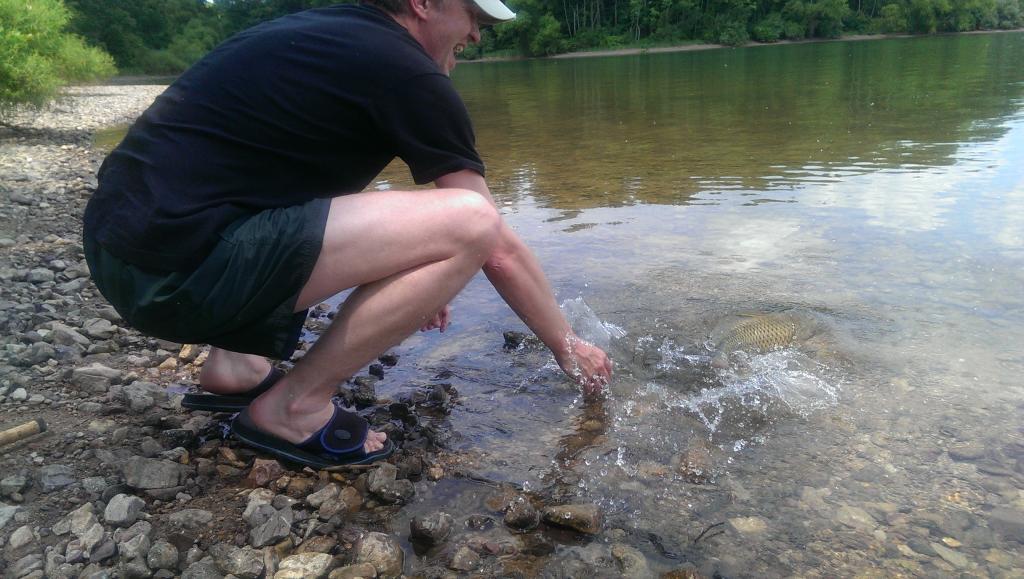 Nuryju kartėlį, kabinu tris sliekus, užteks žaisti su mailiumi. Sėdžiu, laukiu, saulė kepina. Kažkas valą judina, viršunė suvirpa, bet ne kibimas, kažkas sukiojasi aplinkui, laukiu toliau "pirštas ant gaiduko". Rimtas kibimas, kertu, sėdi!!! Jaučiu, kad tikrai didesnė žuvis nei mano ankstesni hibridai ir ešeriukai. Kelios akimirkos ir mano Karšis jau šalia kranto, graibštas keliauja pasitikti mano svečio. Šiaip ne taip įraitau jį vidun ir jau atsipalaidavęs traukiu jį link savęs su šypsena iki ausų.