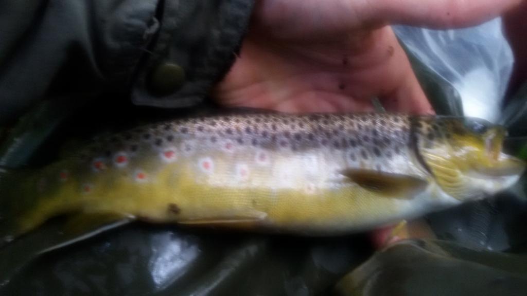 Ir kas per padaras tas žuveliokas. Kiek matau, ryški šoninė linija, raudoni taškai vienoj linijoj. Ir tamsios dėmės ant šonų gražiai išrikiuotos. Pagaunu tokių ir aš, spurda kaip elektriniai. O pagaunu ir tikrų upėtakiukų, kad ir maži, bet daug raudonų, netvarkingai išsidėsčiusių taškų, nėr tamsių dėmių. Gal, sakau, čia paleisti iš veisyklų kokie?