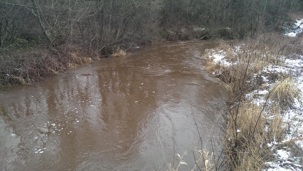 Pasirinkau upelį, mano manymu, labai logiškai - vasarą jis yra gan seklus, platus, didelę dalį teka per miškus. Išvada - vanduo jame turėtų būti ne per aukštas ir apyskaidris. Pravažiavau pro "motininę" upę - vanduo ne peraukštas ir apyskaidris. Patenkintas, kad būsiu teisingai viską čia išmastęs, privažiuoju upelį...... ir kągivataitaunakągi prašom jums kakavinio vandens penkiagubą normą :lol: