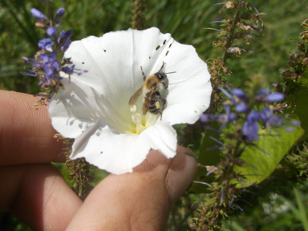 "aborigenų" pastatytus vartus,net nežinau kokias jie apeigas galėjo atlikinėti.Vėliau vaikštant pakrante ir ieškant tinkamesnės vietos žvejybai ir pagaliukų susmaigstytu į pakrantės smėlį supratau kad tie "aborigenai" dar ir "murziai",nes statė "šniūrus".Susitvarkius žvejybos vietą nuėjau nufotografuoti įvairiausių kvapų bei spalvų Nemuno pakrantės augalų.Štai pirmoji gėlė + bitutė.