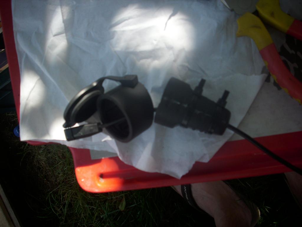 Su sąlyga kad mėšlo neg... su sąlyga kad toks daiktas - nedideli žemos įtampos lizdukai su hermetiškais dangteliais gamtoje neegzistuoja, prisimenam sovietinę vaikystę ir darom iš to, ką įmanoma gaut - iš detalės iš "Litagros" - tokio, tipo guminio ilgintuvo galo. Iš galo išimam vidurius, perpjaunam jį per pusę ir galo antro galo vieną pusę dar perpjaunam išilgai :-D. Į antrą galą sukišam sonaro kabelį ir suklijuojam tą išilgai perpjautą atgal, kaip parodyta 3 pav.: