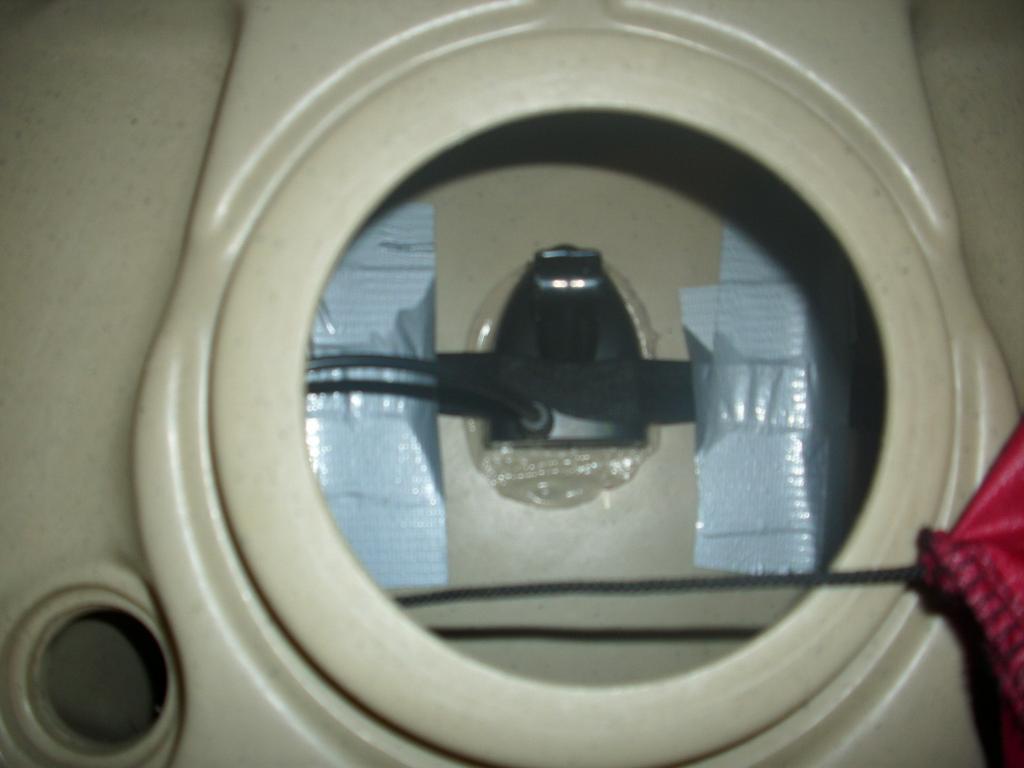 Pasirodo buvau pamiršęs nufotkinti pačio sonaro tvirtinimą. In the hull, lengviausiai prieinamoj ir lygioj vietoj - po bardačioko skyle. Santechninis hermetikas + duct tape dėl viso pikto. Rytoj pratestuosiu...