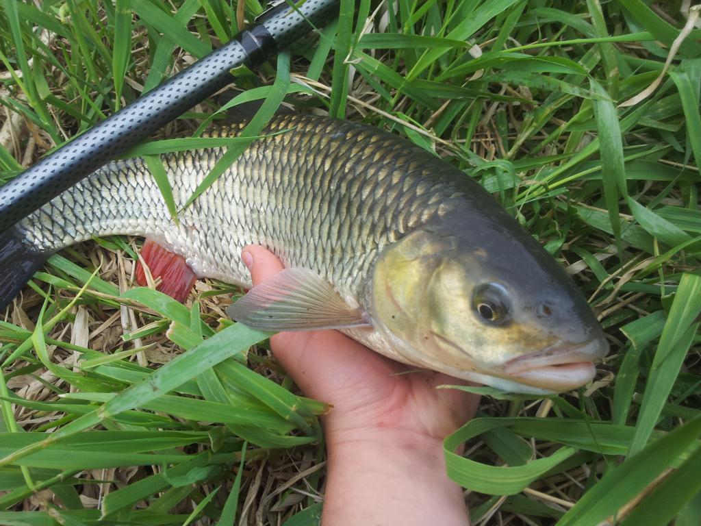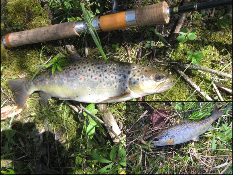 Taigi, pirmieji metimai ir leidžiuosi pasroviui. Oras bjaurus, tad stebulų nesitikiu, bet plūdė dingsta, seka kirtimas ir nieko. Kartoju pravedimą ir keliais metrais toliau plūdė vėl nuneria, kirtimas ir ... smūgis pakirtus prilygsta tam, kurį gauni su spiningu. Šapalas metasi į krantą, bėgu kiek kojos neša, kad tik neįsipainiotų kranto žolėse, vis gi pavadėlis 0,14. Kova smagi, žuvis energinga ir po kelių minučių pirmasis gražuolis krante :)